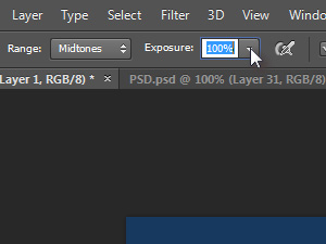 ![]() V orodni vrstici zgoraj nastavite Range na Midtones in Exposure 100% (glej sliko). |