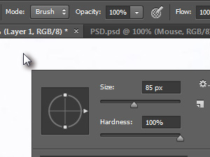 ![]() Kliknite z desnim miškinim gumbom na dokument in nastavite poljubno velik čopič ter Hardness 100% (glej sliko). V orodni vrstici zgoraj naj bodo nastavljene vse privzete vrednosti (glej sliko). |