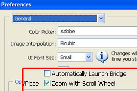 Odpre se okno s spošnimi nastavitvami. Najbolj zanimiva nastavitev je History States, kjer lahko določate, koliko korakov nazaj naj Photoshop shrani (undo). Onačite Zoom with Scrool Wheel, če uporabljate sredinski miškin gumb, saj boste tako lahko približevali in oddaljevali sliko kar s sredinskim gumbom. |