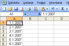 Aha...če sem že ravno pokazal zgornji način (hitrega) vpisa datumov.... morda je dela (tipkanja datumov) še manj, če datum vpišeš samo v celico A1, torej 1.1.2007 (seveda vse zgoraj napisano in tole, tule, velja ne le za datume ampak tudi za navadna števila...recimo v celico A1 vpišeš 100, v A2 101 in ponoviš, zgoraj opisani postopek)