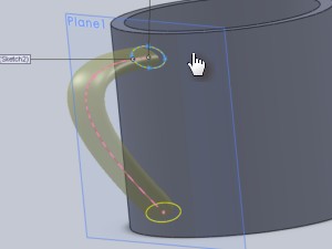 ![]() Na Right Plane narišite obliko ročaja, z orodjem Spline (risanje krivulje), ki ga najdete v zavihku Sketch. En konec mora biti v sredini elipse, drugi pa na dnu skodelice in mali v skodelici. Ko končate pritisnite semaforček. |