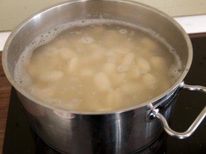 Ko voda zavre, vanjo stresite njoke. Njoki so gotovi, ko splavajo na vrh.