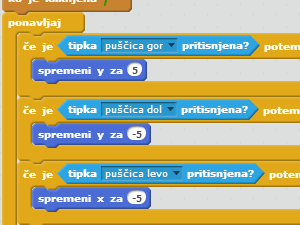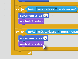 ![]() Najprej k premikanju za levo in desno dodajte ukaz: naslednji videz |