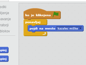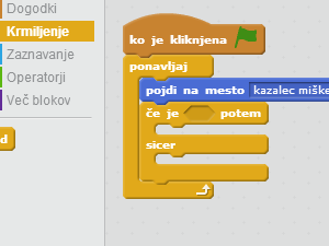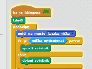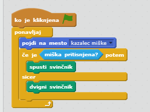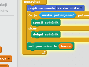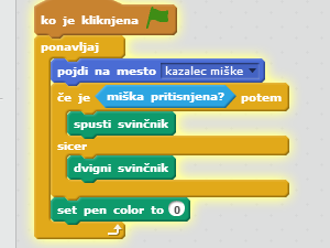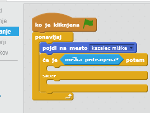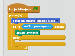 ![]() V če je _ potem, sicer vstavite ukaz miška pritisnjena?, ki ga najdete med zaznavanjem. |
