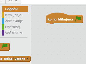 ![]() Potem odprite zavihek skripte in v polje za sestavljanje ukazov vnesite ukaz ko je kliknjena zastavica, ki ga najdete med dogodki. |