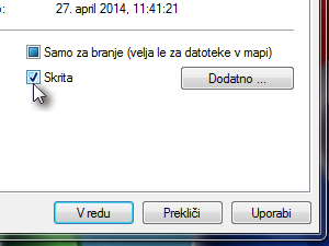 ![]() Ko pa hočeš, da je spet normalno vidna mapa pojdi spet pod lastnosti in označi, da ni skrita! |