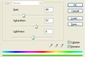 Označite Colorize. Potem pa z drsniki poljubno določajte barve. Jaz sem določil Hue 99, Saturation 57 in Lightness 0. Kliknite na gumb OK. |