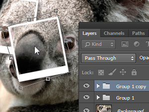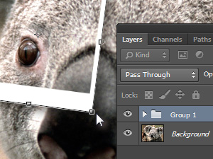 ![]() Kliknite zgoraj na Layer in izberite Group Layers. S tem smo označena layerja združili v skupino in si tako omogočili lažje nadaljno delo. Kliknite zgoraj na Edit in izberite Free Transform. Nato pa z miško držite za rob skupine na dokumentu in ga obrnite okoli svoje osi (glej sliko). Potrdite spremembe s tipko Enter. |