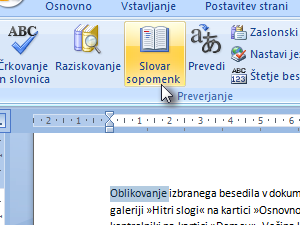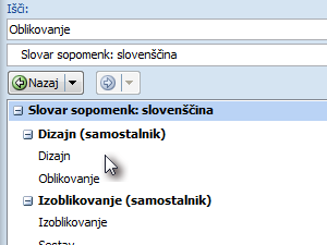 ![]() Na desni strani se bo odprlo okno, kjer bodo prikazane sopomenke za označeno besedo. |