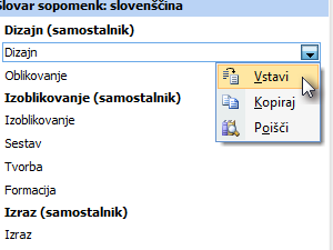 ![]() Na desni strani kliknite puščico, da odprete padajoči meni. Kliknite Vstavi, da besedo prenesete v besedilo. |