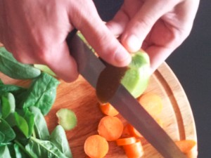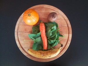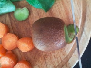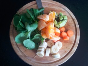 Pripravite sadje in zelenjavo ter jih dobro umijte. Če je možno, prioročamo uporabo domačih sadov. Jaz sem uporabil pomarančo, kivi, korenje, banano in mlado špinačo. |