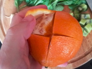 Pomarančo najlažje olupimo tako, da z nožem zarežemo kot je razvidno na sliki. Mogoče je lažje, če prej olupite zgornji in spodnji del pomaranče. |