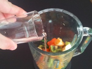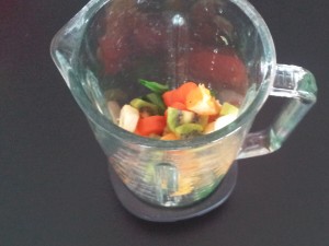 In tako naprej nadaljujte tudi z ostalimi sadeži. Važno je, da so narezani na male koščke. |