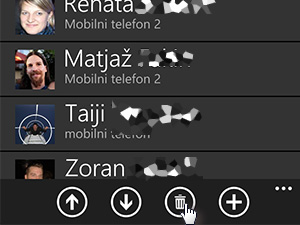 ![]() Stik lahko premikate tudi z gumbi spodaj. Ko je stik označen, ga lahko tudi pobrišete s ikono za brisanje. Če želite dodati stik iz imenika (ljudje) pa tapnite na gumb za dodajanje (plus). Stik v hitrem klicanju urejate tako, da najprej držite s prstom na njemu toliko časa, dokler se vam ne označi oziroma obarva.