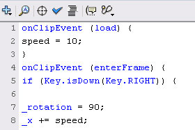 onClipEvent (load) { speed = 12; } onClipEvent (enterFrame) { if (Key.isDown(Key.RIGHT)) { _rotation = 90; _x += speed; } if (Key.isDown(Key.LEFT)) { _rotation = 270; _x -= speed; } if (Key.isDown(Key.UP)) { _rotation = 0; _y -= speed; } if (Key.isDown(Key.DOWN)) { _rotation = 180; _y += speed; } if (Key.isDown(Key.RIGHT) && Key.isDown(Key.UP)) { _rotation = 45; } if (Key.isDown(Key.LEFT) && Key.isDown(Key.UP)) { _rotation = 315; } if (Key.isDown(Key.RIGHT) && Key.isDown(Key.DOWN)) { _rotation = 135; } if (Key.isDown(Key.LEFT) && Key.isDown(Key.DOWN)) { _rotation = 225; } } |
