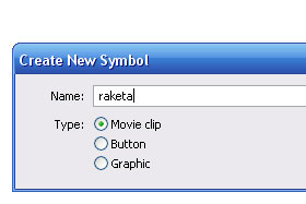 V polje Name vpišite raketa, spodaj v polju Type pa označite Movie clip. Kliknite na gumb OK. |