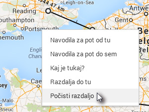 ![]() Ko boste meritve želeli izbrisati, kliknite z desnim miškinim gumbom na zemljevid in izberite Počisti razdaljo. |