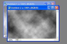 Na kratko. Akcijski posnetek je odprl nov dokument, določil črno barvo, uporabil filter Clouds in pomanjšal dokument. |
