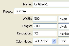 Odpre se okno za ustvarjanje novega dokumenta. V polje Width vpišite 500 in v polhe Height 300 pixels. Kliknite na gumb OK. |