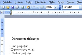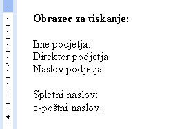 Jaz sem si izmislil obrazec za izpolnitev podatkov o podjetju, ki so namenjeni za tiskanje. Podjetja predloge uporaljajo tudi največkrat z "nogo" in "glavo" podjetja. |