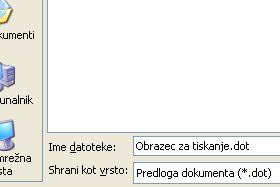 V polje Ime datoteke vpišite poljubno ter logično ime. Spodaj v polju Shrani kot vrsto preko izbrinika določite Predloga dokumenta. Kliknite na gumb Shrani. |