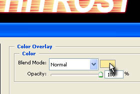 Prikažejo se nove nastavitve. Blend Mode naj ostane določeno Normal. Kliknite na kvadratek za izbiro barve in izberite rumeno barvo. Kliknite na gumb OK, da potrdite spremembe. |