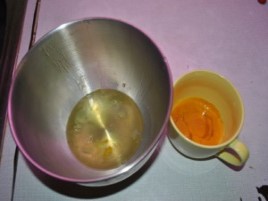 Za začetek ločimo beljake in rumenjake vseh 5ih jajc. Slike žal niso najboljše v tem vodiču. |