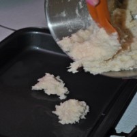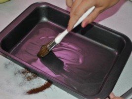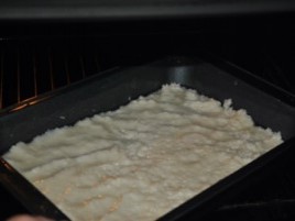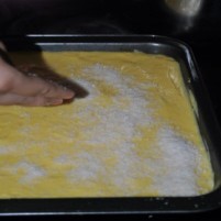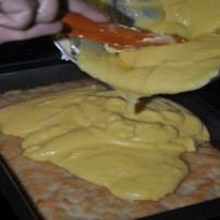 Maso vsujemo in enakomerno razporedimo po pekaču. |