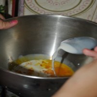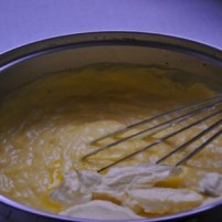 Ko mleko zavre, ga odstavimo z ognja in vanj hitro vmešamo zmes iz rumenjakov. Nato pa kozico za 1-2 minuti vrnemo na majhen ogenj. |