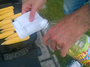 Koruzne strože navlažite z oljem po njihovi celi površini, da se bodo lepo zapekli. Olja naj bo čisto malo in ni potrebno, da so storži čisto navlaženi. |
