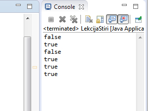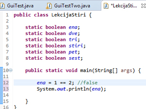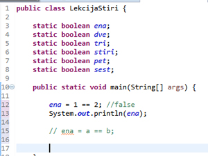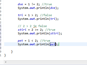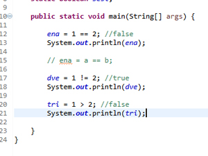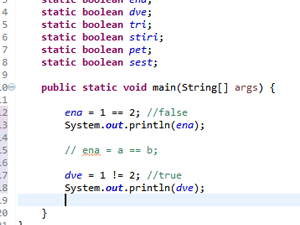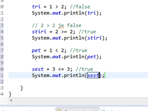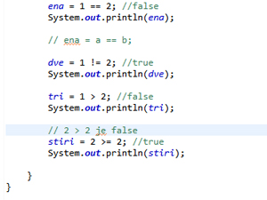 ![]() Sedaj pa bomo v main metodi primerjali dve številki in rezultat takoj za tem izpisali v konzoli. Operator se imenuje je enako (ang. Equal to). Znak == primerja dve števili in vrne true, če sta številki enaki in false, če sta različni. V tem primeru bomo dobili false.