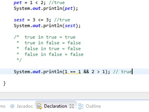 ![]() AND (znak &&) Vrne true, ko sta obe trditvi pravilni. Primeri: 1 == 1 && 2 > 1; true 1 != 1 && 2 > 1; false 1 == 1 && 2 < 1; false 1 != 1 && 2 < 1; false Logiko lahko uporabljamo tudi direktno v print stavkih. Večvrstični komentar ustvarimo tako, da na začetek napišemo /*, na konec pa */. |