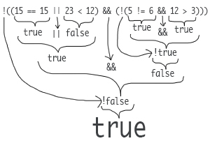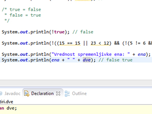 ![]() Obstaja še en operator. Not operator (znak !) Spremeni rezultat. Primera: !true; false !false; true |