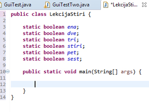![]() Sedaj bomo ustvarili nekaj boolean spremenljivk brez, da bi jihm nastavili vrednost. Samodejno bodo nastavljeni na false, vendar bomo to potem spremenili. Ustvarili jih bomo v razredu in poskrbeli, da bodo statične. |