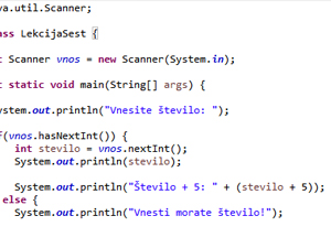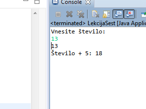 ![]() Sedaj lahko tudi izpiše vsoto danega števila + 5. System.out.println("Število + 5: " + (stevilo + 5)); |