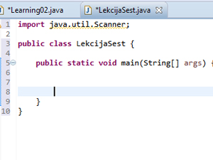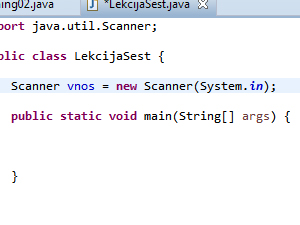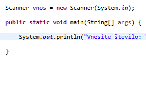 ![]() Sedaj pa bomo na začetek programa vnesli sledečo kodo: import java.util.Scanner; S tem smo uvozili knjižnico, ki nam bo omogočila uporabo nekaterih zelo uporabnih metod. Obstaja še ogromno takih knjižnic. |