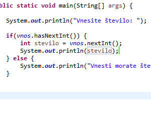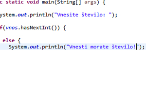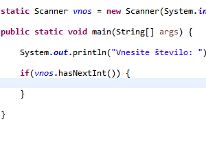![]() Nato pa bomo ustvarili if stavek, med oklepaje pa bomo zapisali: vnos.hasNextInt() To je metoda iz knjižnice, ki smo jo prej uvozili. Ta metoda vrne true, če ima Scanner z imenom vnos shranjeno vrednost int. Če pa je nima bo vrnil false. Če želimo preveriti, ali ima Scanner na voljo drugačno vrednost zamenjamo int z drugo vrednostjo: hasNextByte() preveri za byte hasNextShort() preveri za short hasNextLong() preveri za long hasNextFloat() preveri za float hasNextDouble() preveri za double hasNext() preveri, če je kakšna vrednost na voljo |