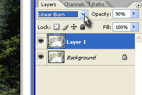 Nastavite layerju senčenje na Linear Burn in Opacity na 90% (glej sliko).