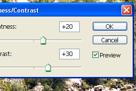 Odpre se novo okno. Povečajte za malenkost vrednosti Brightness in Contrast. Jaz sem Brightness povečal na +20 in Contrast na +30. Kliknite na gumb OK. |