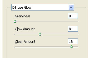 Potem pa kliknite zgoraj na na Filter, Distort in izberite Diffuse Glow... Odpre se novo okno. Graininess nastavite na 0. Glow Amount in Clear Amount pa nastavljajte poljubno... Ne zaprite še okna... |