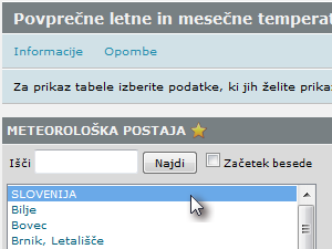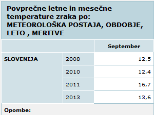 ![]() Podatki s povprečnimi temperaturami za izbrana leta in mesece bodo prikazani v tabeli. |