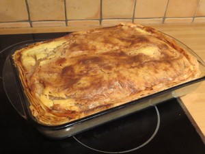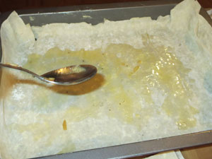 Začeli bomo s sestavljanjem. Vzemite pekač in ga z maslom v celoti premažite, da se sestavine ne bodo zapekle. Postavite na dno pekača vlečeno testo. Vlečeno testo sem kupil in je možno, da ga bo potrebno prej z nožem razrezati na tako velike kose, kakor je velik vaš pekač. |