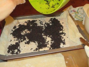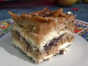 Na prvo nadstropje (oziroma pritličje) listnatega testa dodajte polovico makovega nadeva (glej sliko) ter ga lepo razporedite po celotni površini. |