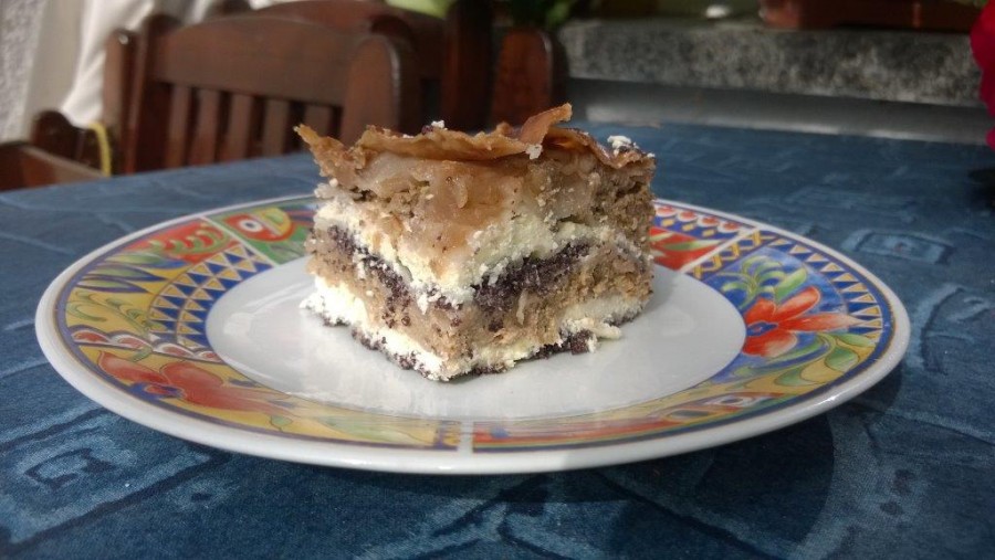 Spet ponavljamo posopek, kjer vse skupaj pokrijte in potlačite z novim vlečenim testom ter ga ponovno premažite z tekočim maslom. Dodajte drugo polovico makovega nadeva in ga razporedite. |