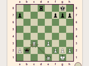 ![]() Beli ne more pojesti črne kraljice, saj bi v tem primeru sledil mat s trdnjavo, zato je prisiljen kraljico odmakniti. Prestavi jo na polje e8, da obenem zaščiti trdnjavo, ki je bila prav tako napadena. |