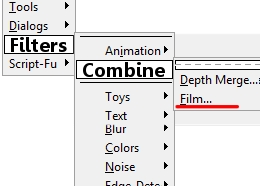 Nato v ospredje pokličemo prazno delovno površino in z desnim klikom v notrenjosti okna kliknemo: Filters --> Combine --> Film