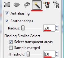 Z magično paličico, ki je nastavljena tako kakor kaže na sliki bomo označili vinsko rdeč trak okoli slik, kakor tudi bele prostore oz. luknjice. Da označimo vse najprej stisnemo na rdeč trak in nato držimo tipko Shift in klikamo na prazne bele prostorčke da dodajamo v označeno polje. Radius: 2,0 Threshold: 1,0 |
