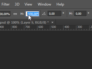 ![]() Klikknite zgoraj na Edit in izberite Free Transform. V načinu transormacije najprej obrnite layer tako, da zgoraj na polje H nastavite -100% (glej sliko). Ne potrdite še sprememb ... |