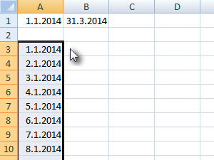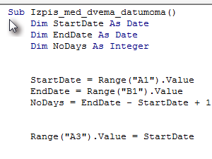 Koda v StartDate in EndDate prebere začetni datum iz polj A1 in A2. Nato izračuna število dni med tema dvema datumoma ter s funkcijo Resize razširi polje A3 na število dni, pri čemer vmesne vrednosti zapolni kronološko. |