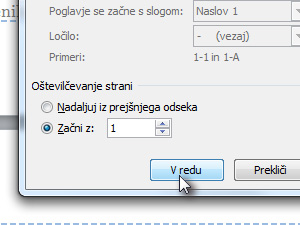 ![]() V novem oknu pri polju Oštevilčenje strani označite Začni z in nastavite 1. Kliknite na gumb V redu. |